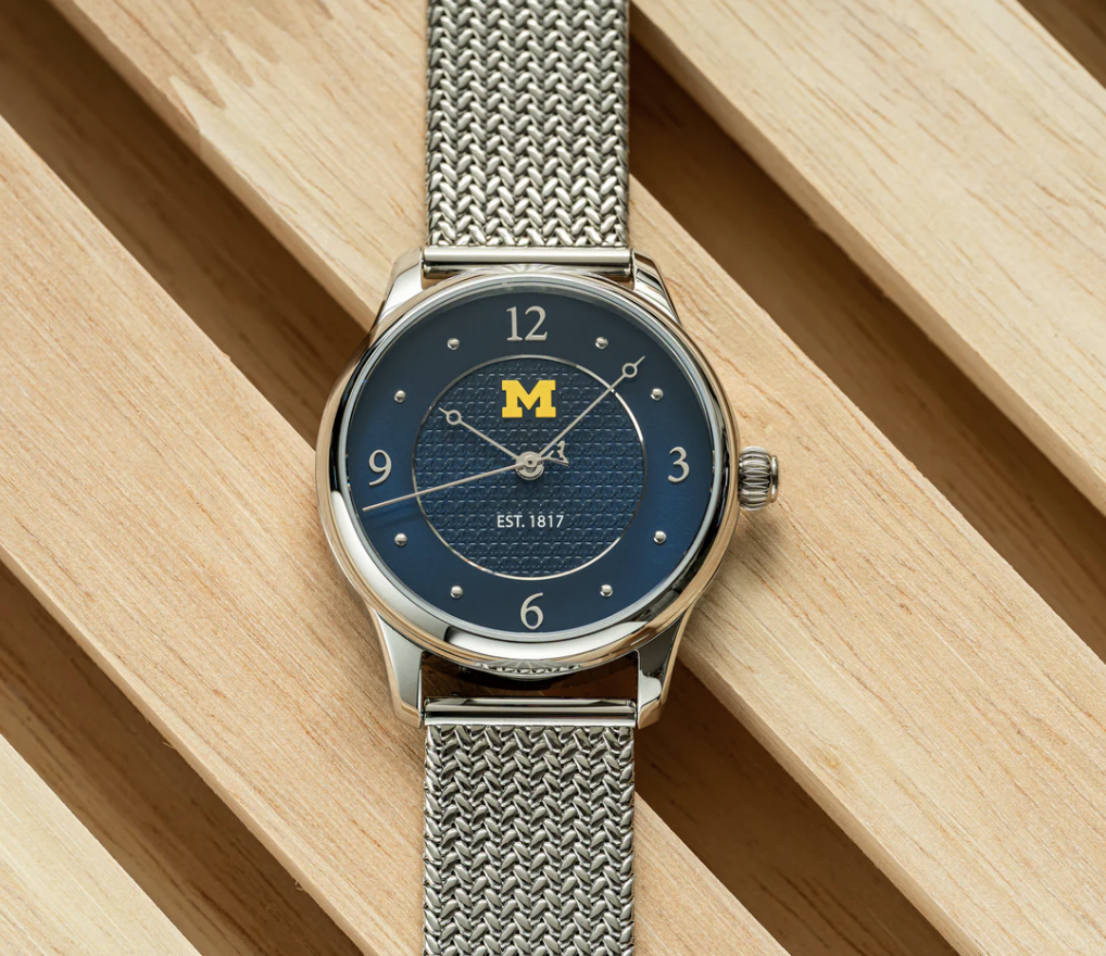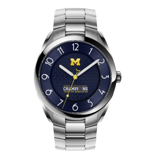 The 2023 National Champions Odysseus features the block ”M" logo on prime real estate and an embossed repeating pattern on the dial, a navy blue sapphire bezel insert, and "MAIZE AND BLUE" on the chapter ring.