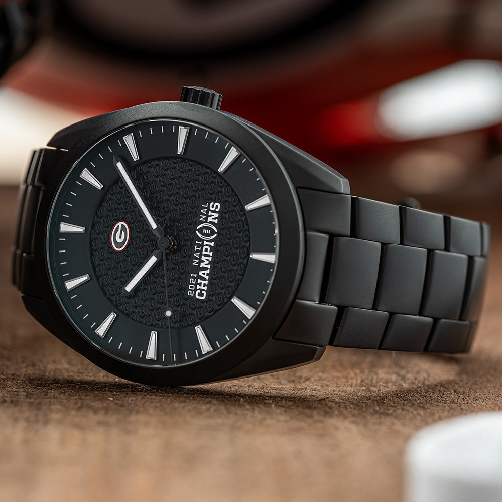 The solid 3-link 316L stainless steel bracelet features DLC coating to protect from wear and tear, a quick release mechanism for easy removal, and a micro-adjusting buckle for the perfect fit.