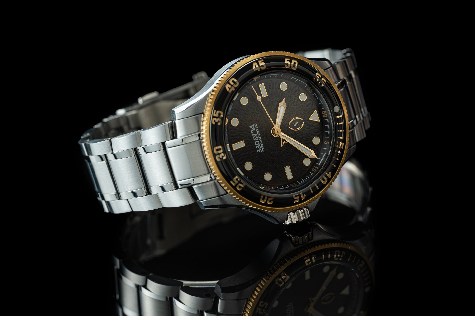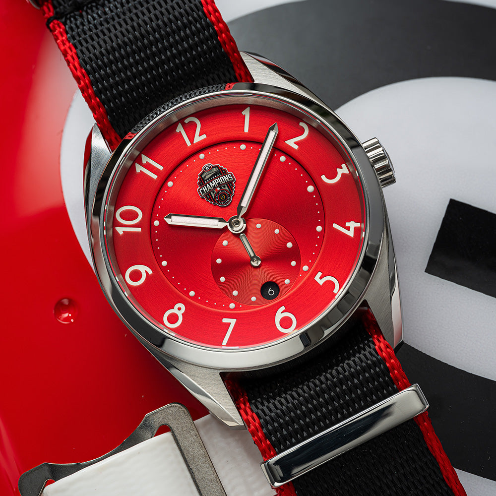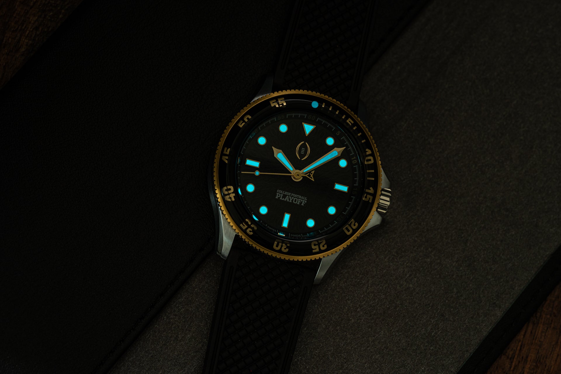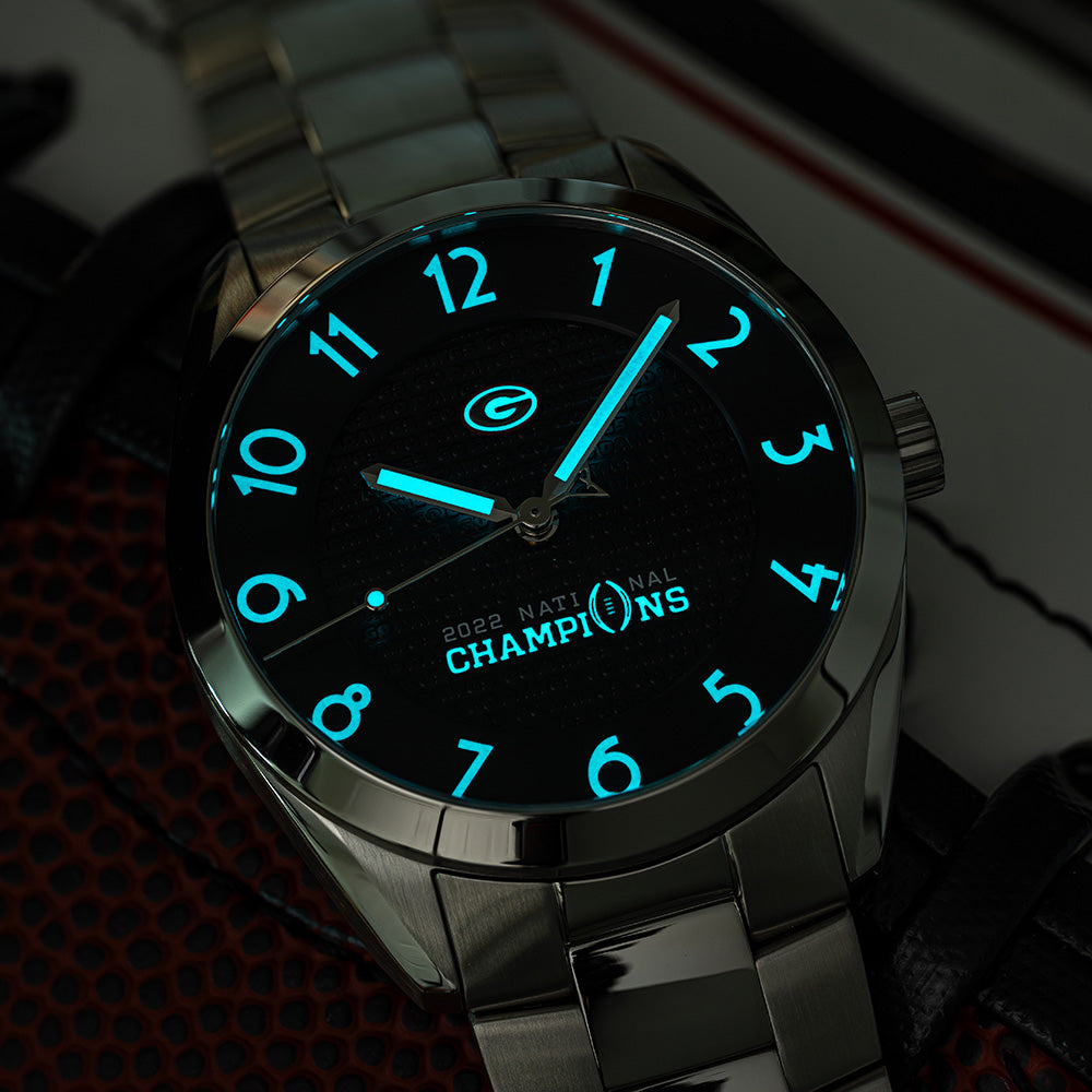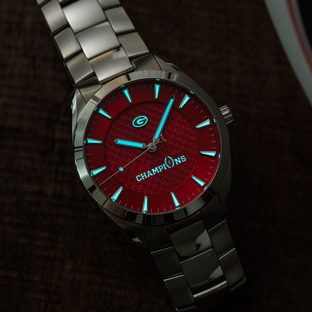 Featuring gold-plated steel hands and applied indexes filled with X1 Super-Luminova, the highest performing grade of photoluminescent material used in watchmaking today.