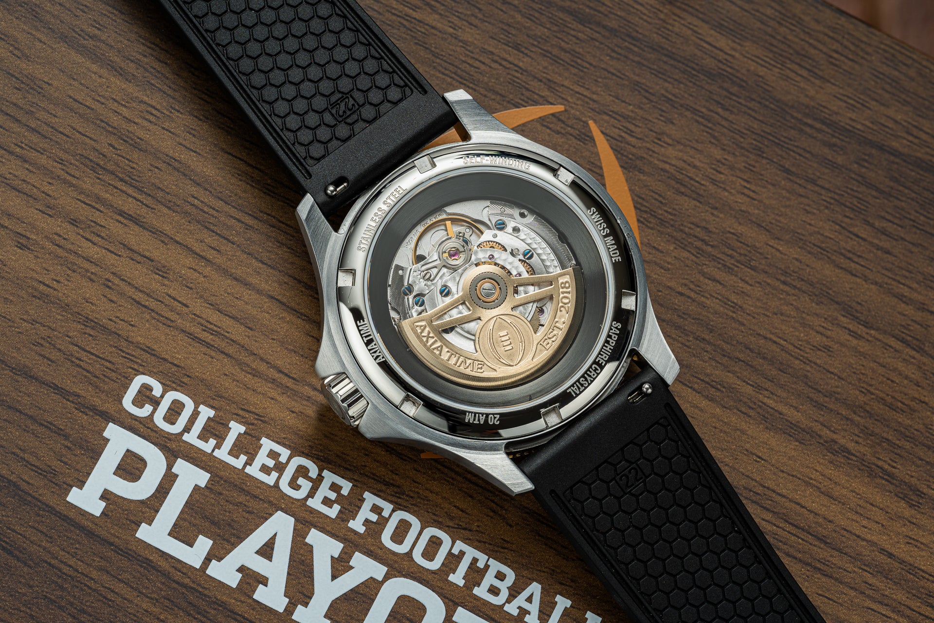 A sapphire crystal caseback displays the Sellita SW200, a decorated 26-jewel, self-winding automatic movement that operates at a frequency of 28,000 VpH (4Hz) and boasts a power reserve of 38 hours.