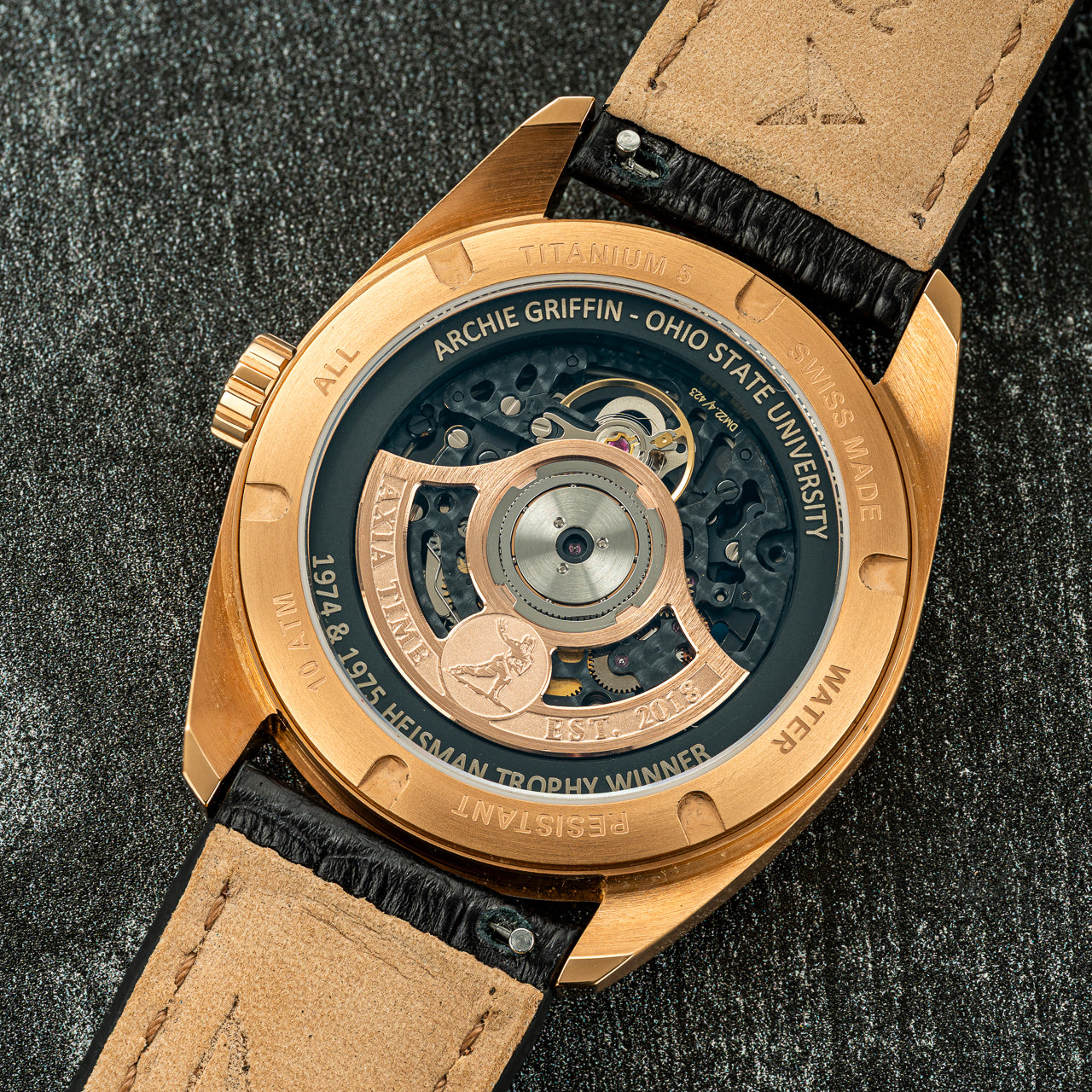 Adding a custom rotor will take your design to the next level. Safely installed under the back sapphire crystal, your custom rotor will be protected from the elements and shine for generations.