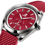 • Iconic ALABAMA Design: A sunray dial in crimson featuring the ALABAMA logo at 12 o’clock and a repeating etched CFP logo on the dial.