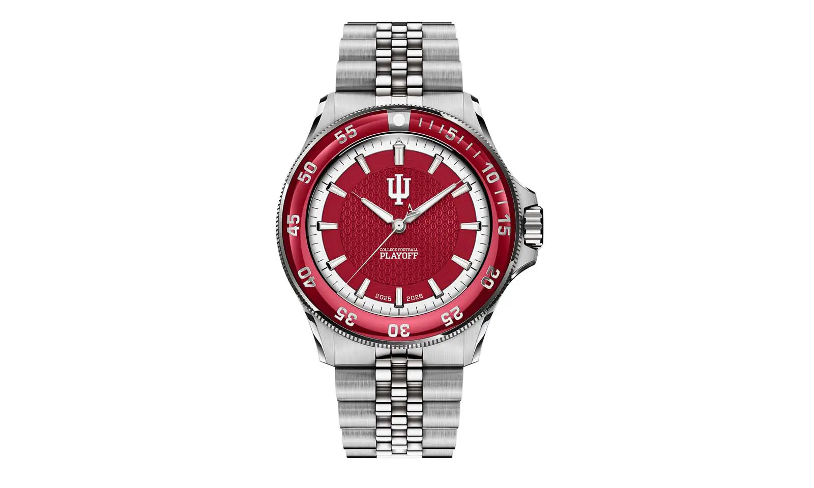 An Ultra-Custom Design That Puts Your Team First: Featuring a sunray dial in Red with the INDIANA logo at 12 o’clock, backed by a subtle etched pattern with the CFP logo, representing the road to the playoffs.