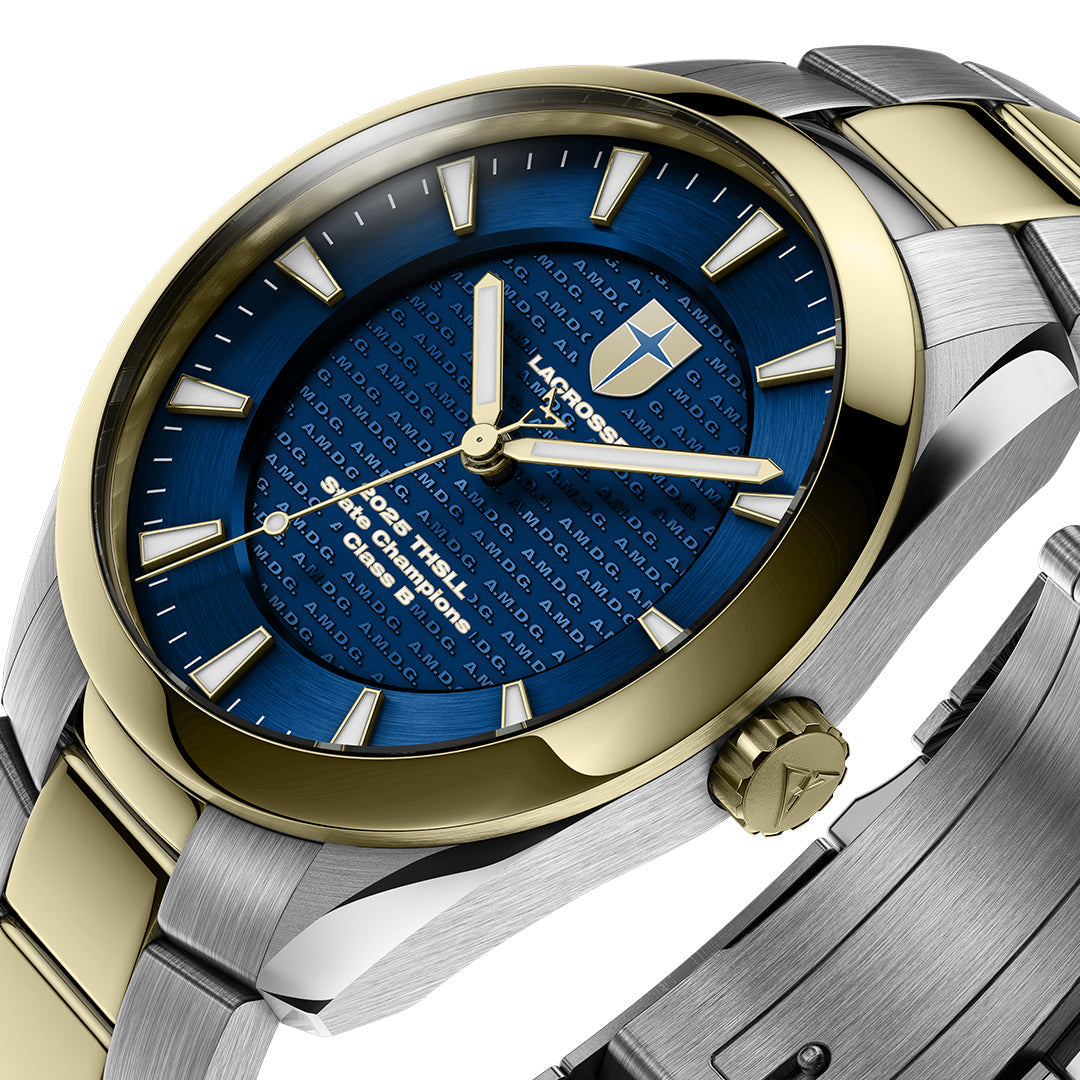 We go the extra mile to celebrate - and elevate - what's important to you: The 202 Texas State Champions Kairos II features the block Jesuit Dallas Crest in prime real estate position, A.M.D.G. embossed as a repeating pattern on a blue dial, and the State Champions graphic on the dial.