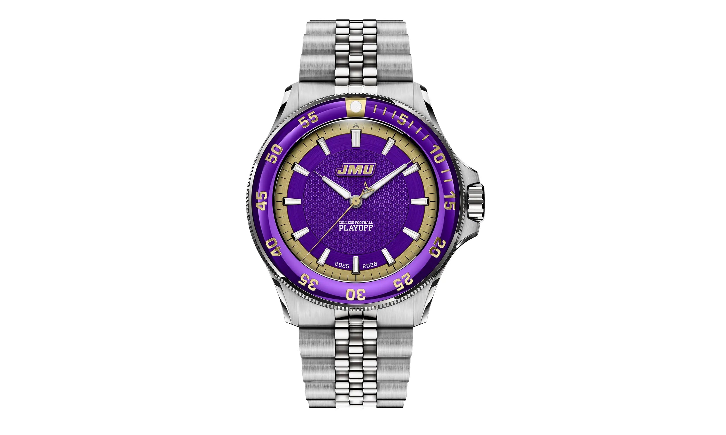 An Ultra-Custom Design That Puts Your Team First: Featuring a sunray dial in Purple with the JMU logo at 12 o’clock, backed by a subtle etched pattern with the CFP logo, representing the road to the playoffs.