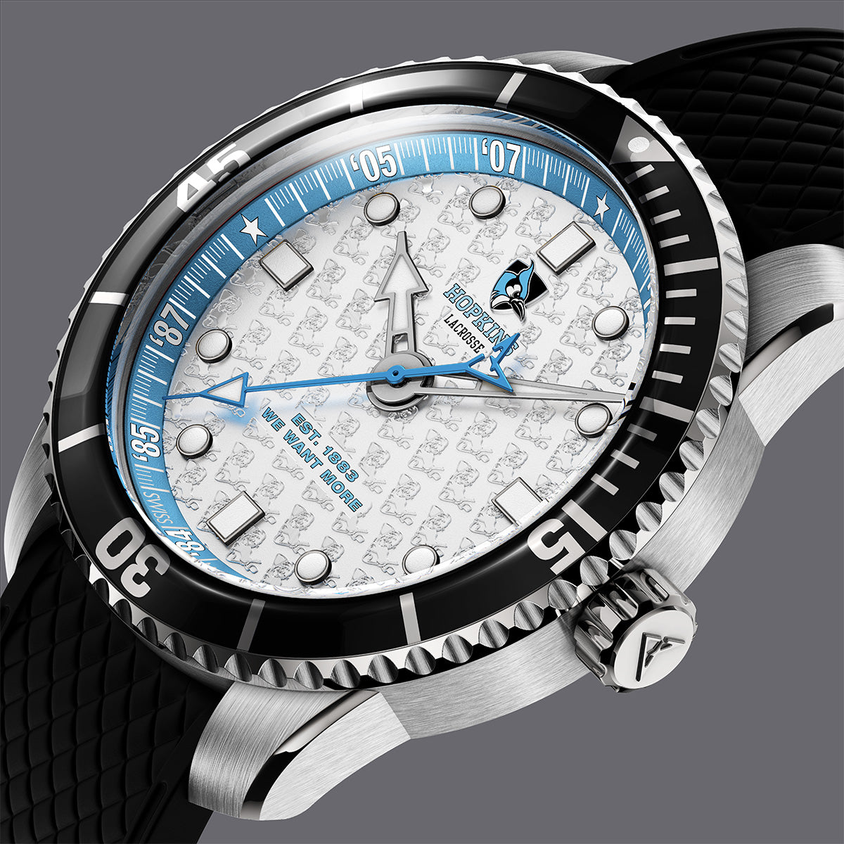 An ultra-custom design for the most storied program in college lacrosse history. The Johns Hopkins Lacrosse Odysseus II features a semi-matte white dial with the “NAG” Bluejay in an embossed repeating pattern, a light blue chapter ring with each of the nine NCAA National Champion teams and three stars to honor the fallen Jays, a light blue second hand, and the Hopkins Lacrosse faithful cheer, “We Want More.” The watch back showcases the custom rotor embossed with a Jay head and a black engraving disc with room for 50 characters.