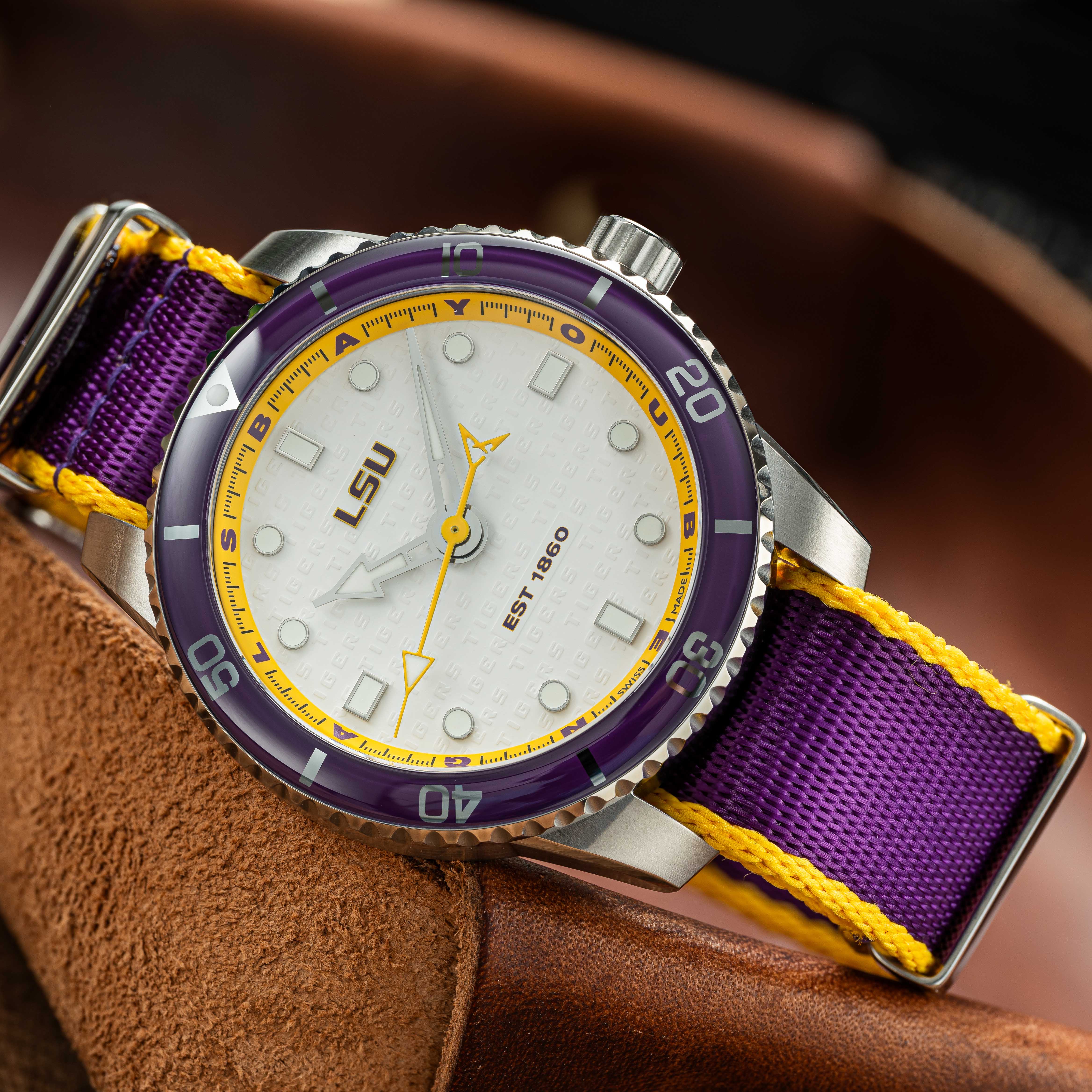 Named for one of the greatest heroes in literary history, ΟΔΥΣΣΕΑΣ, a man of intellect and versatility, strength and endurance, the Odysseus Timepiece is Swiss made automatic (self-winding), with water resistance to 200 meters. The Louisiana State University timepiece comes in a 43.5mm stainless-steel case and matte white dial with "Tigers" embossed in repeating pattern, custom chapter ring marked with "BAYOU BENGALS," and a purple sapphire bezel. The Odysseus is a diver watch with water resistance to 200 meters.
