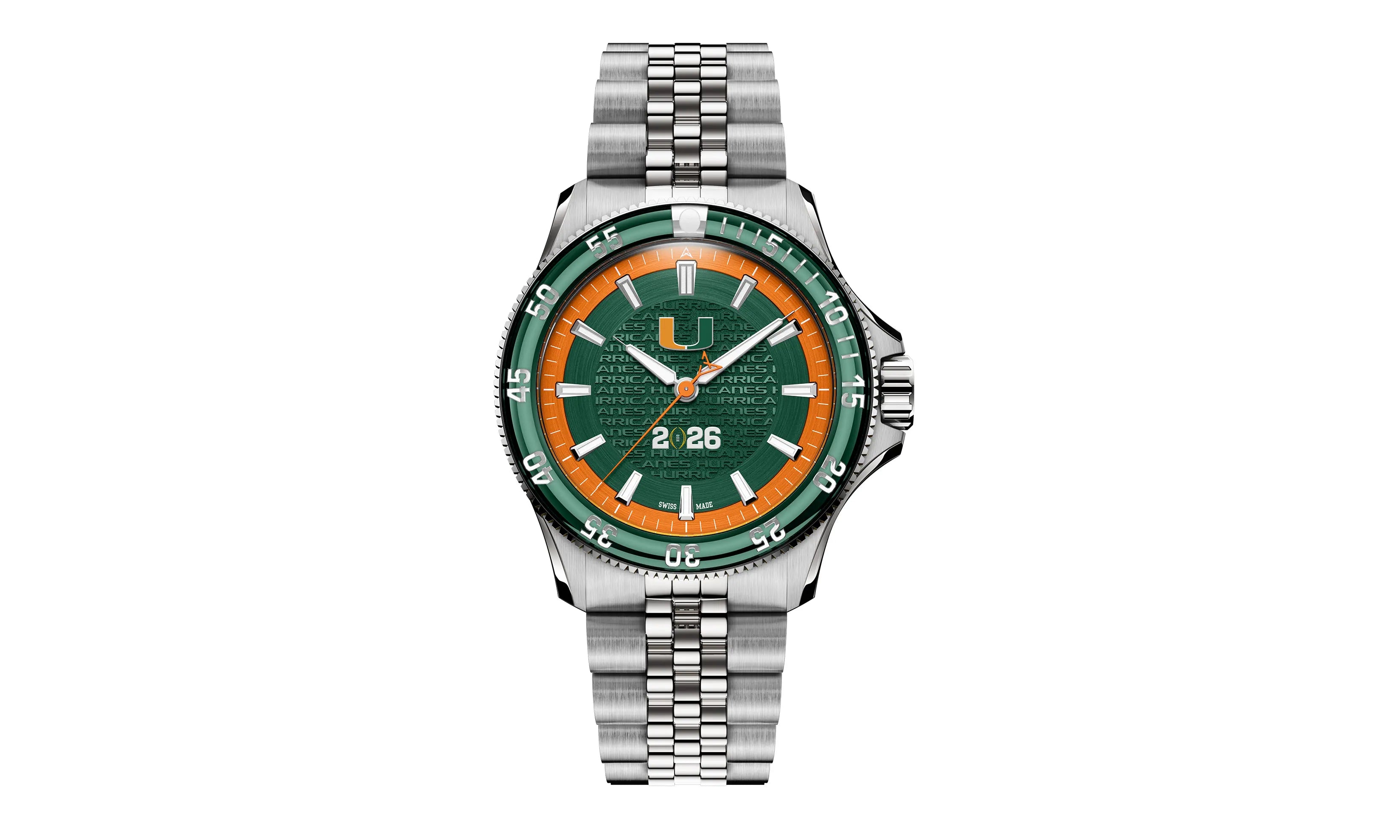 A Swiss Made automatic timepiece custom-designed to celebrate Miami’s journey to the College Football Playoff semifinals. The Miami CFP Argos features a custom Hurricanes-inspired dial pattern, the official 2026 College Football Playoff logo, and the exclusive opportunity to upgrade to the National Championship design if Miami wins it all.