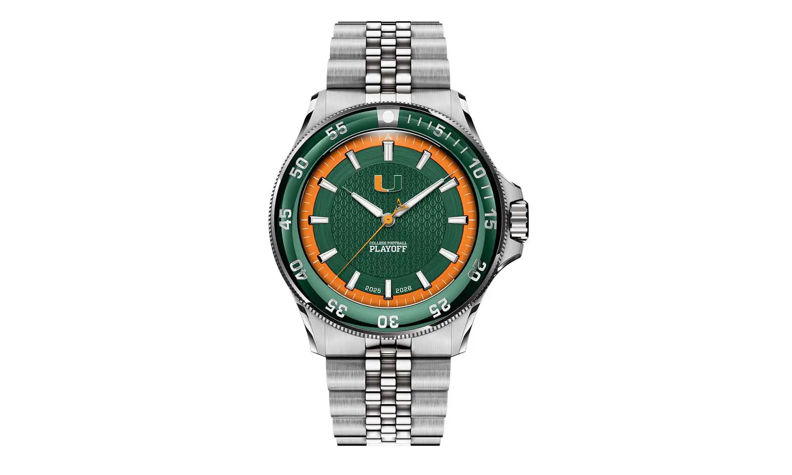 An Ultra-Custom Design That Puts Your Team First: Featuring a sunray dial in Green with the MIAMI logo at 12 o’clock, backed by a subtle etched pattern with the CFP logo, representing the road to the playoffs.