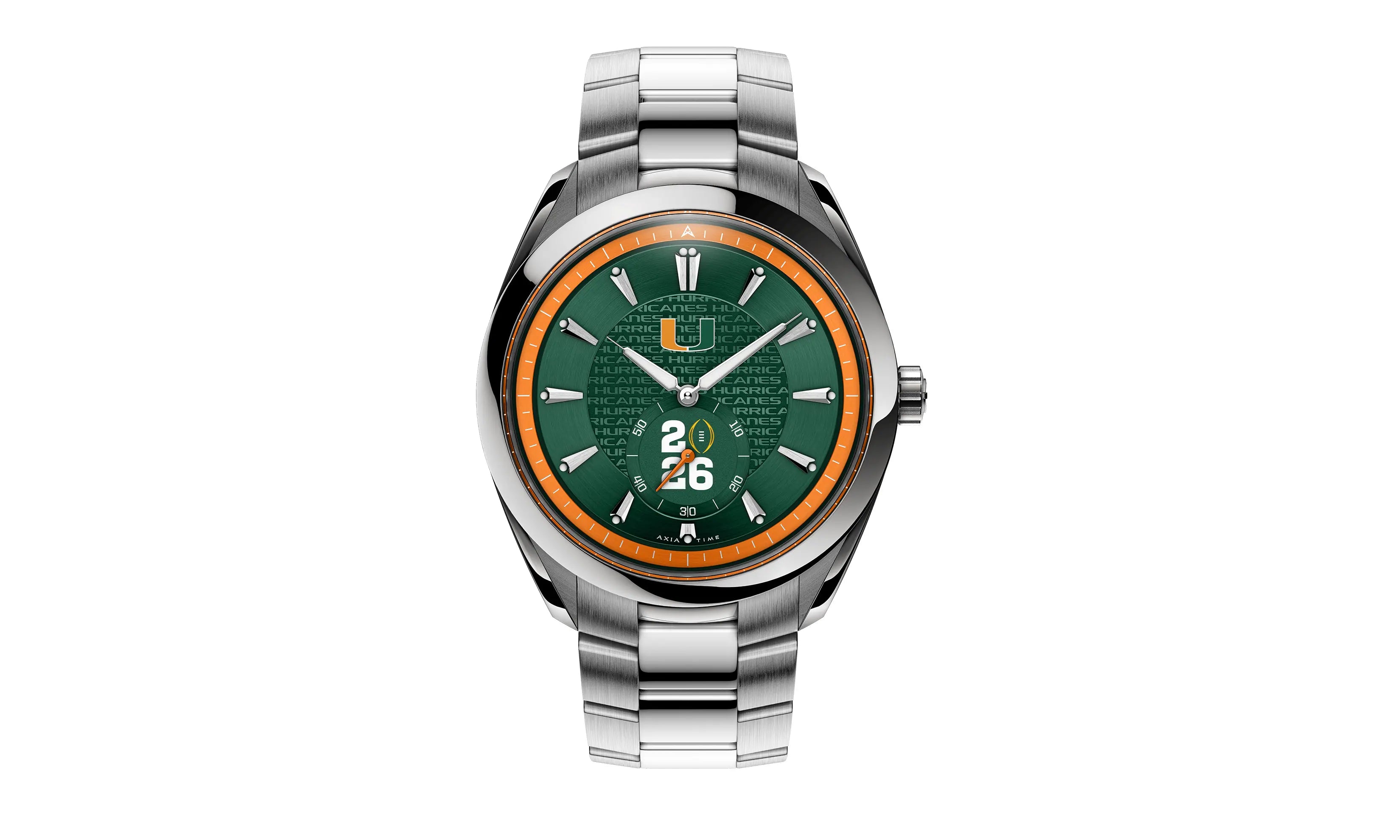 A Swiss Made timepiece custom-designed to celebrate Miami’s journey to the College Football Playoff semifinals. The Miami CFP Lythos features a custom Hurricanes-inspired dial pattern, the official 2026 College Football Playoff logo, and the exclusive opportunity to upgrade to the National Championship design if Miami wins it all.