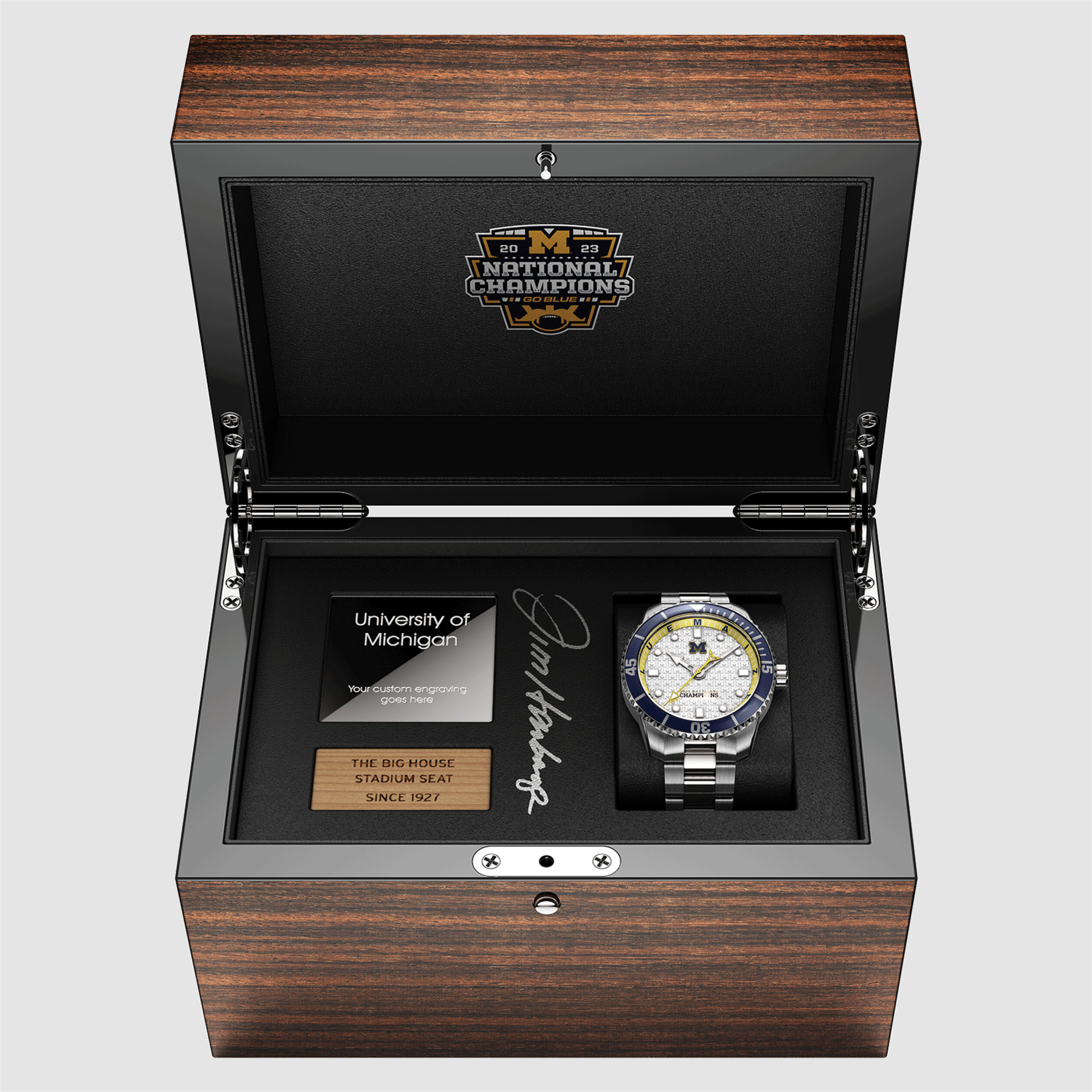 When you select the Jim Harbaugh box set, your wooden display box will come autographed by Jim Harbaugh and with a custom engraved plate and wood from The Big House benches originally installed in 1927 (and a certificate of authenticity). Limited to 300 pieces.