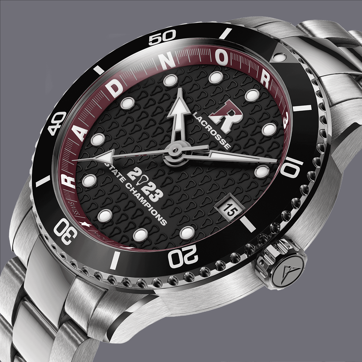 We go the extra mile with commemorative designs to celebrate – and elevate – what's important to you. Customizations for the Radnor 2023 State Champions Odysseus include a black sunray dial with a lacrosse head engraved in a repeating pattern, Radnor Lacrosse logo inhabiting the prime real estate position, and "RADNOR 3PEAT" featured around the chapter ring at the hour marks.
