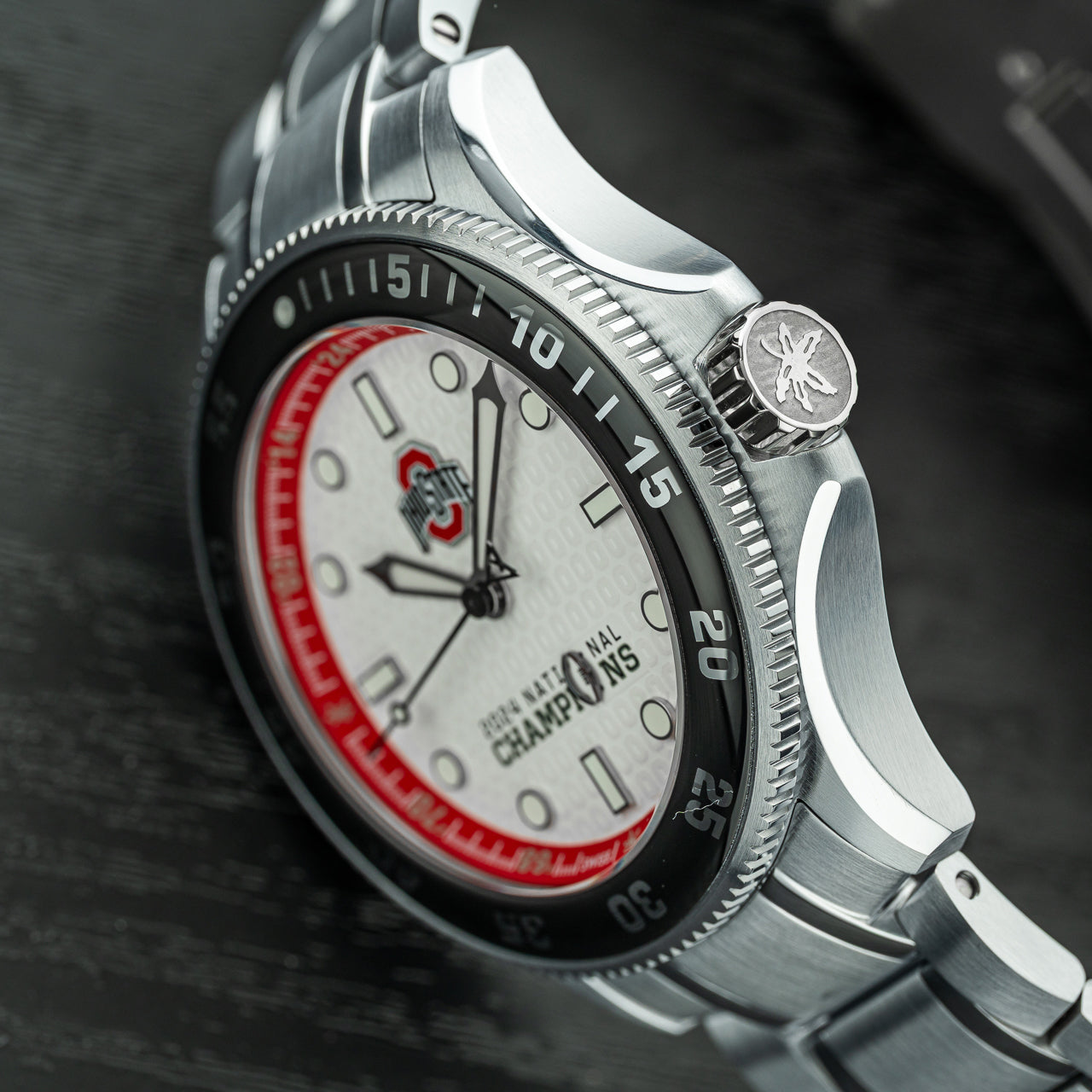 Both functional and beautiful, the crown preserves the water resistance when screwed down while reminding you of your passion for the Buckeyes.