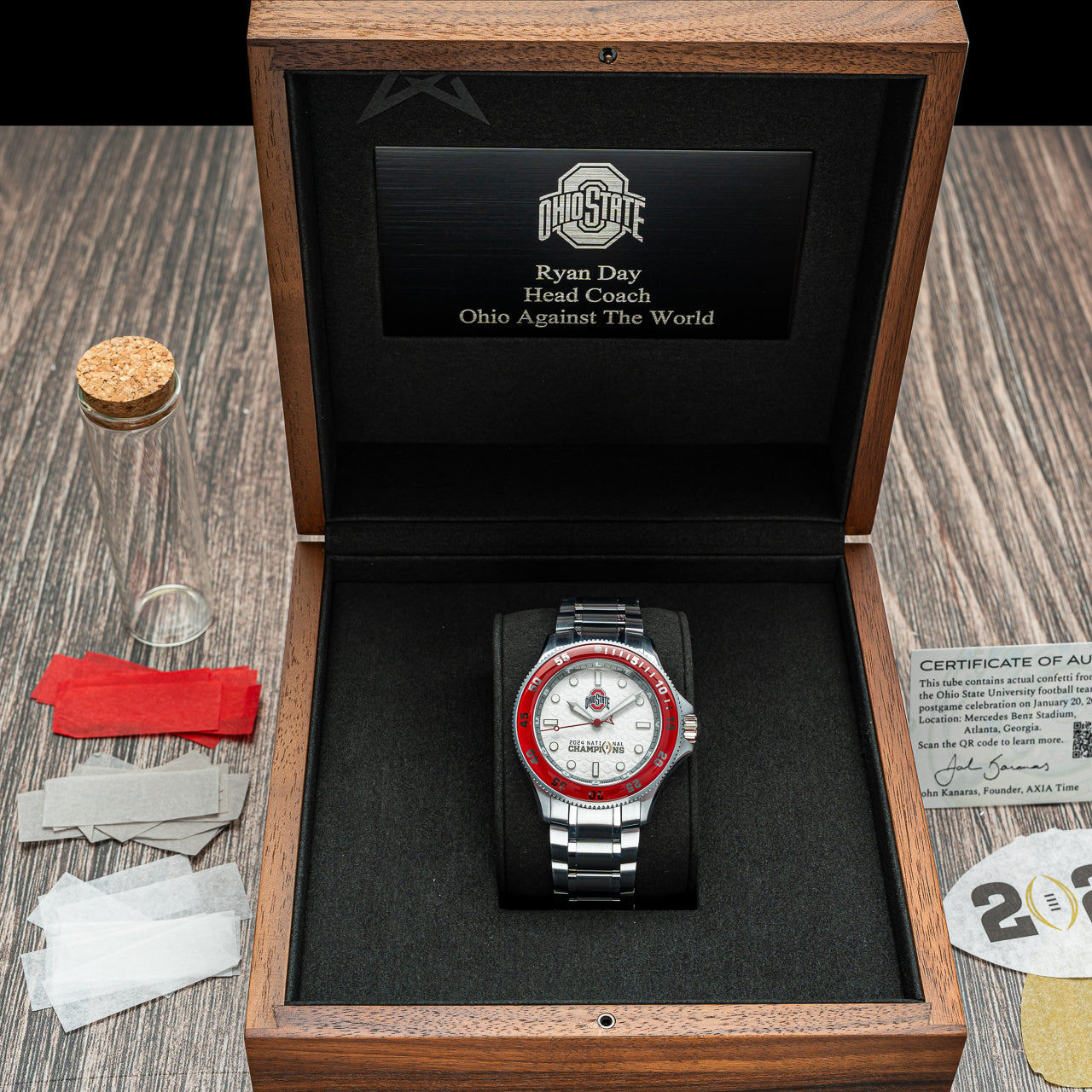 Each Ohio State National Champion timepieces comes with a vial of confetti from the post game celebration in Atlanta.