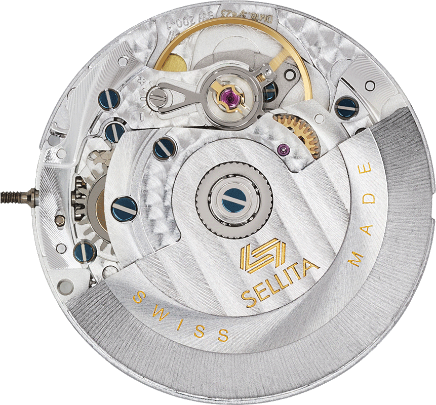 Sellita SW200 Elabore Grade, Rhodium plated with blue screws.