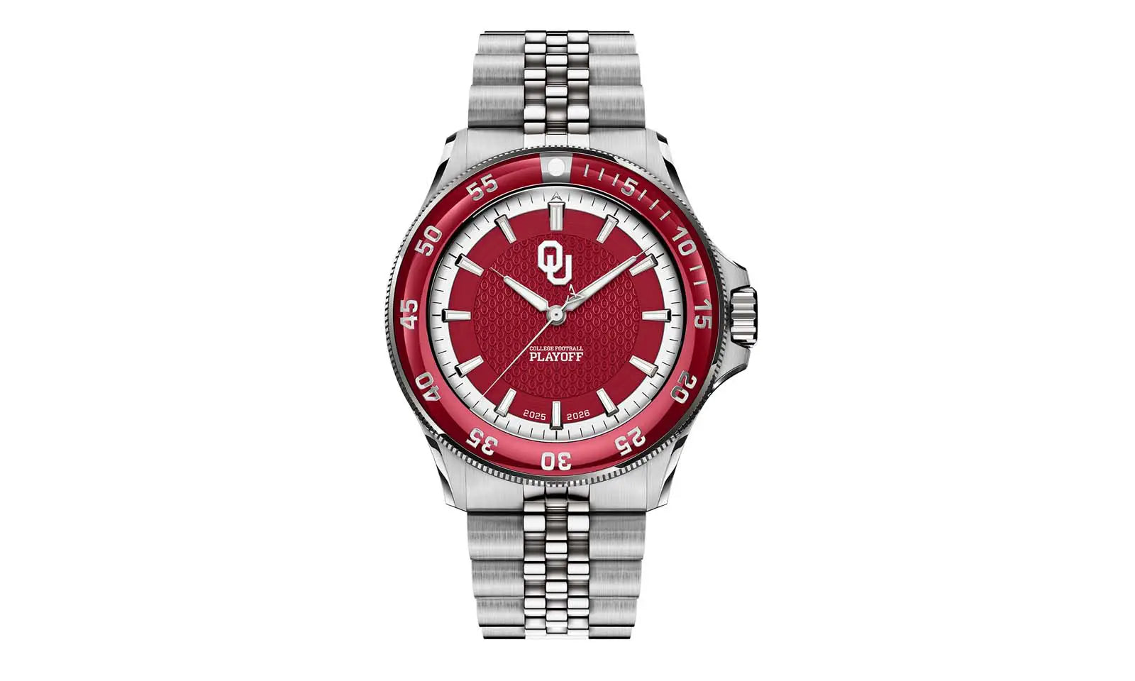 An Ultra-Custom Design That Puts Your Team First: Featuring a sunray dial in Red with the OKLAHOMA logo at 12 o’clock, backed by a subtle etched pattern with the CFP logo, representing the road to the playoffs.