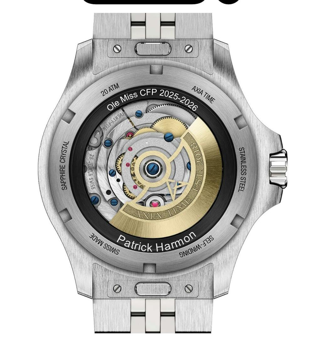 An Ultra-Custom Design That Puts Your Team First: Featuring a sunray dial in Navy with the OLE MISS logo at 12 o’clock, backed by a subtle etched pattern with the CFP logo, representing the road to the playoffs.