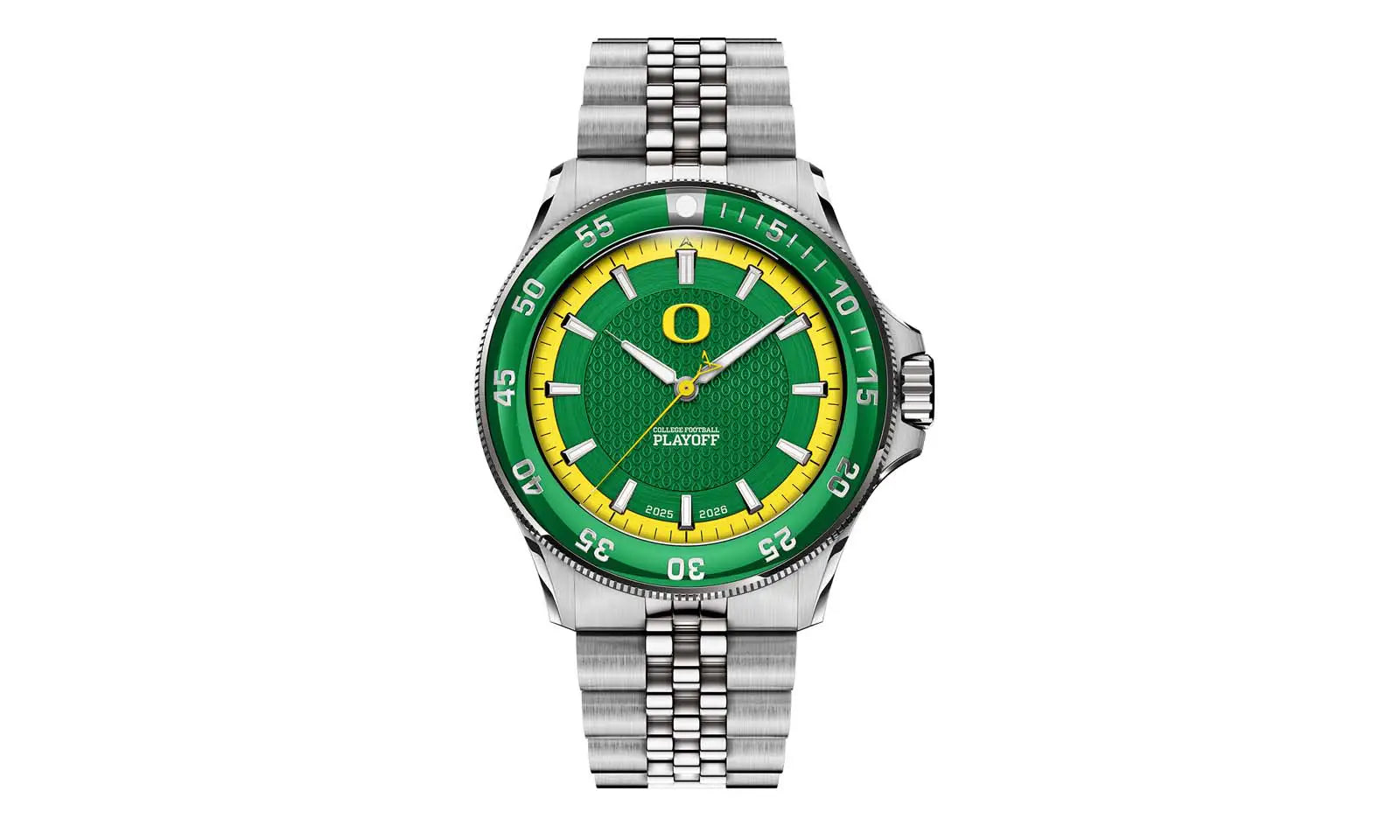 An Ultra-Custom Design That Puts Your Team First: Featuring a sunray dial in Green with the OREGON logo at 12 o’clock, backed by a subtle etched pattern with the CFP logo, representing the road to the playoffs.