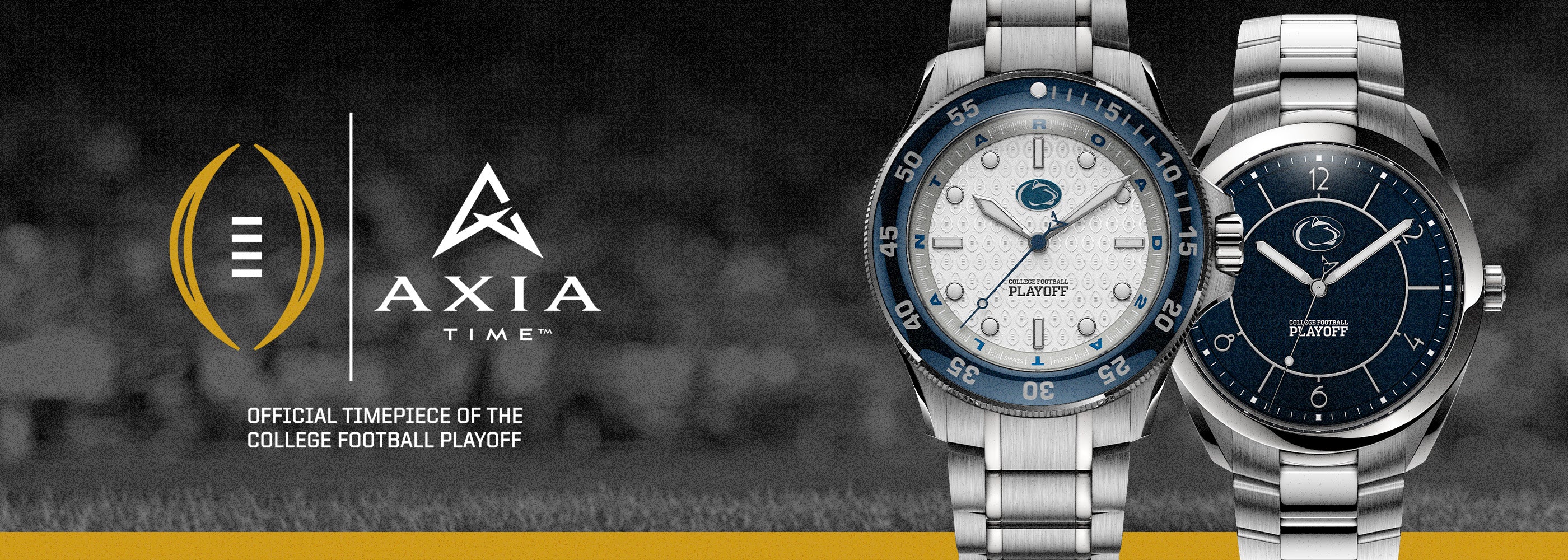 We go the extra mile with commemorative designs to celebrate – and elevate – what's important to you. Customizations for the CFP 2024-25 Penn State Argos includes a matte white dial with a Nittany Lion head logo " at 12 o'clock, an etched repeating pattern with CFP logo, the College Football Playoff wordmark on the lower half of the dial, and "ROAD 2 ATLANTA" on the grey chapter ring.
