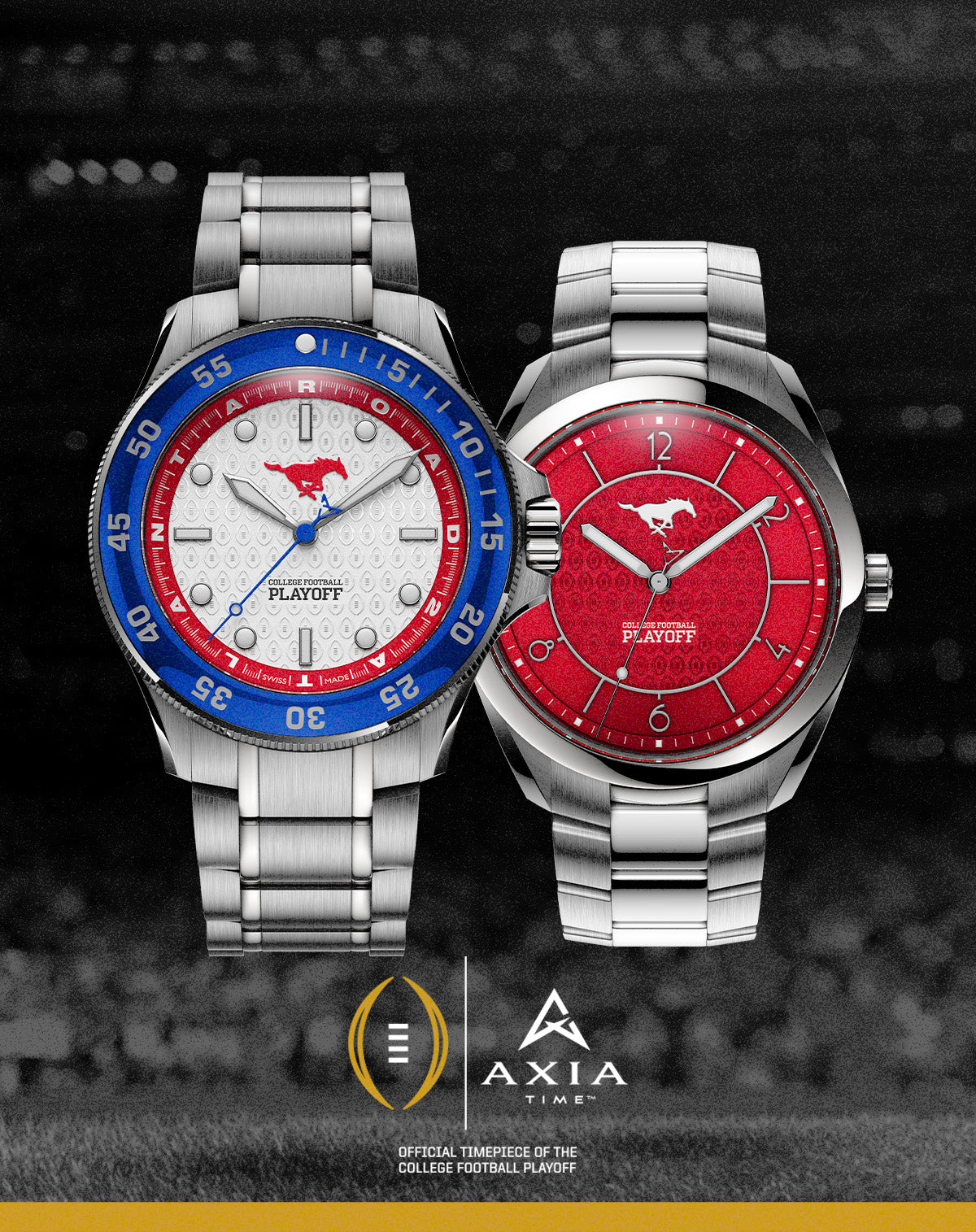 We go the extra mile with commemorative designs to celebrate – and elevate – what's important to you. Customizations for the CFP 2024-25 SMU Argos includes a matte white dial with a red Mustang logo at 12 o'clock, an etched repeating pattern with CFP logo, the College Football Playoff wordmark on the lower half of the dial, and "ROAD 2 ATLANTA" on the red chapter ring