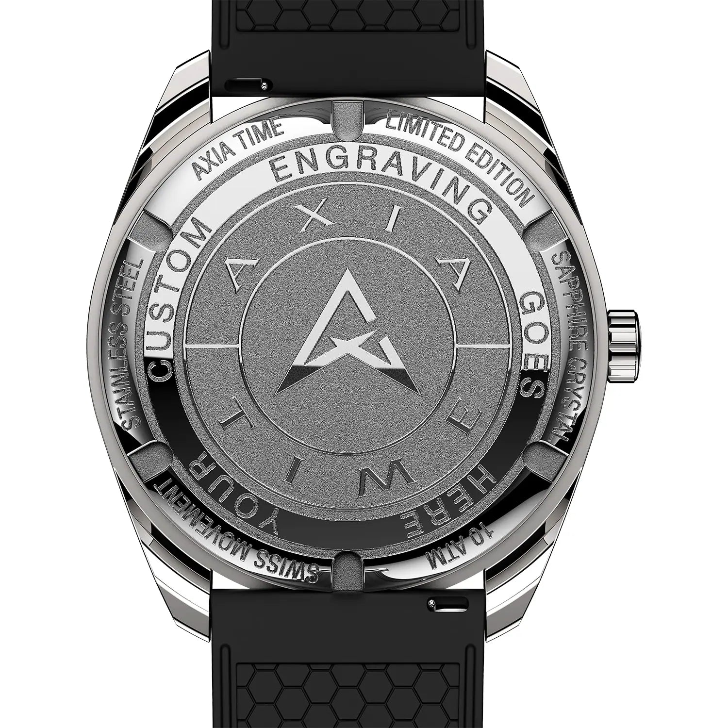 We offer custom engraving on the back case- just outside the circle that includes the AXIA TIme logo.