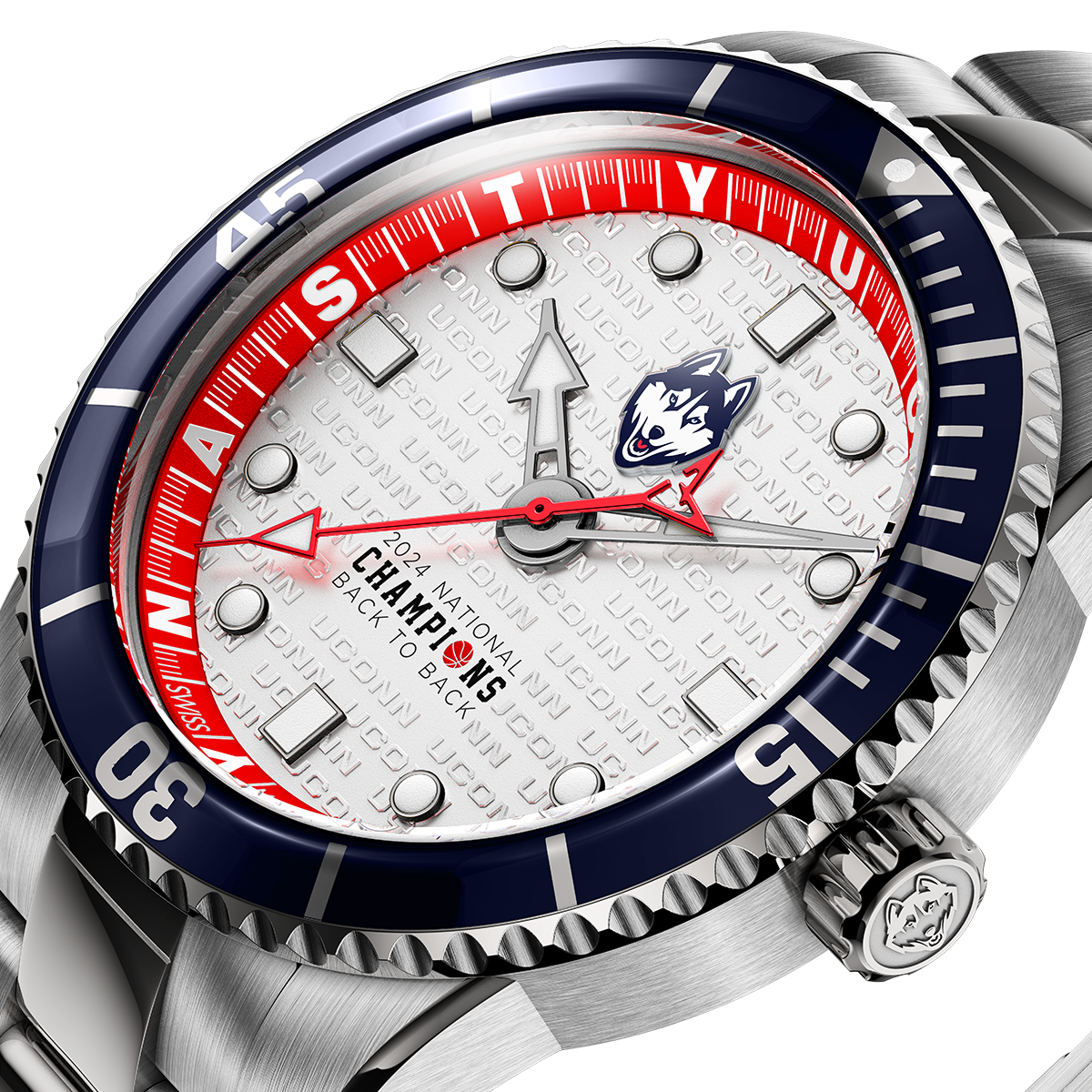 This isn't your typical piece of commemorative jewelry. We go the extra mile to elevate what's important to you. From the dial with a repeating embossed UCONN logo pattern, the Husky logo in prime real estate position, and UCONN DYNASTY around the chapter ring at the hour marks, to the Husky logo engraved on the rotor and the crown, and UCONN engraved on the steel bracelet buckle, we pay painstaking attention to every detail.