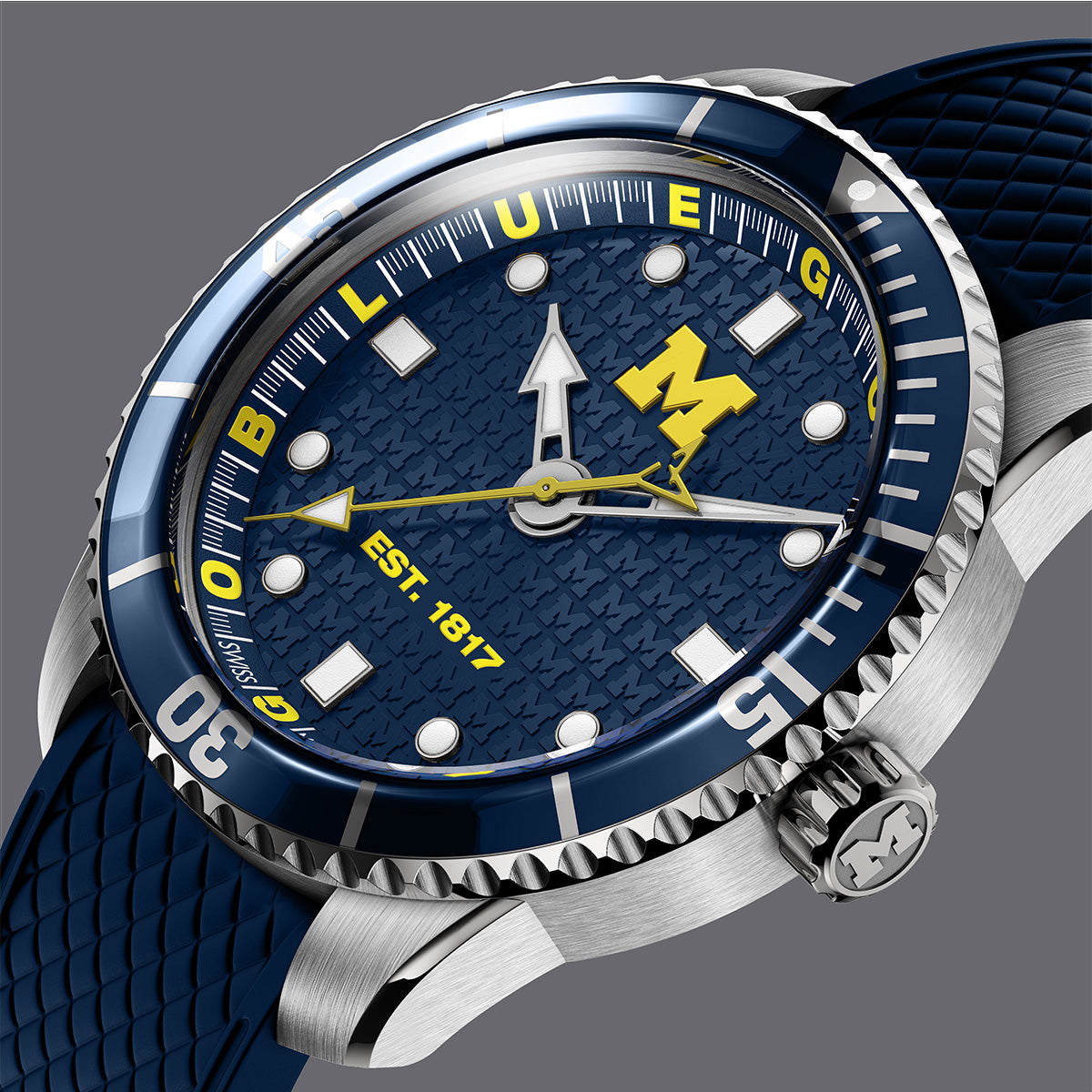 Named for one of the greatest heroes in literary history, ΟΔΥΣΣΈΑΣ—a man of intellect and versatility, strength and endurance. The University of Michigan Odysseus II comes in a 43.5mm brushed stainless-steel case with screw-down crown and is water resistant to 200 meters.