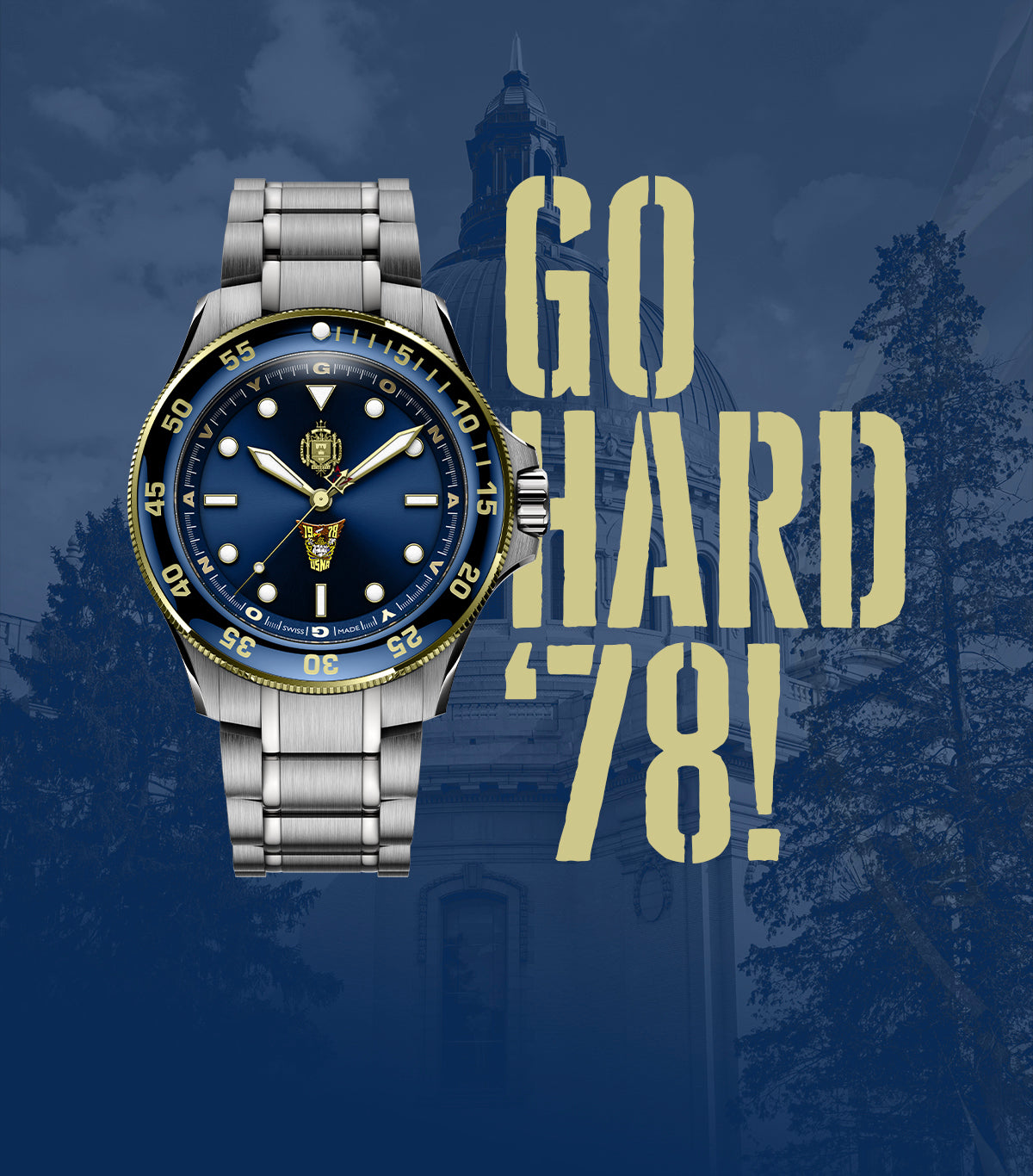 We go the extra mile with commemorative designs to celebrate – and elevate – what's important to you. Customizations for the US Naval Academy Class of 1978 Argos include a royal blue sunray dial with a gold USNA crest at 12 o'clock, Class of 1978 Crest at 6 o'clock, a trident on the end of the second hand, a custom rotor embossed with N* and "Ex Scientia Tridens," and "GO NAVY" repeated along the chapter ring at the hour marks.