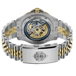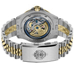 The exhibition caseback opens onto a custom rotor engraved with the Charging Goat and EX SCIENTIA TRIDENS. It's the part most people will never see, which is exactly why it matters.
