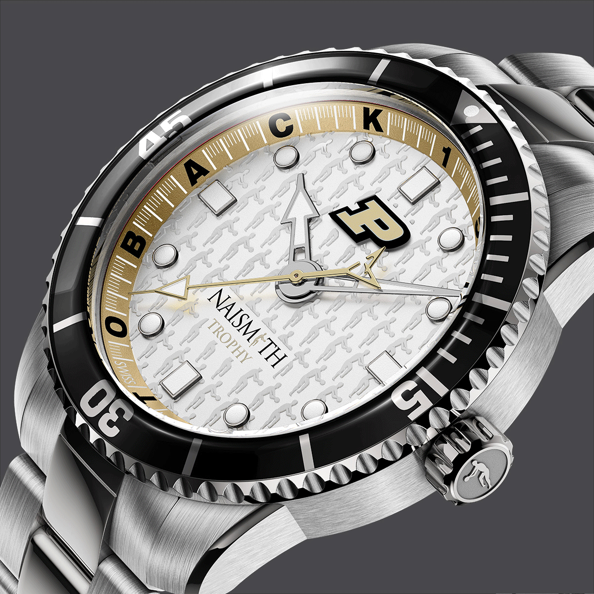 The design of this limited-edition timepiece features the logos and colors of Purdue and Naismith, with additional details that make it extra special for the Boilermaker faithful: A chapter ring that reads “15 BACK TO BACK” around the hour marks, the Naismith player icon embossed on the matte white dial and the crown, and the Purdue P on the steel bracelet buckle. The rotor features an embossed maple leaf, honoring Zach's Canadian heritage.